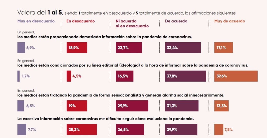 A continuación, se analiza la percepción de la cantidad de información proporcionada sobre el coronavirus y su impacto en la comprensión de lo que estaba sucediendo. Para ello, se utilizan preguntas como ¿Los medios proporcionan demasiada información sobre el coronavirus? y ¿La excesiva información sobre el coronavirus me dificulta seguir cómo evoluciona la pandemia? Sabiendo que la pandemia vino de la mano de la infodemia, un fenómeno definido por OMS como una excesiva cantidad de información, en ocasiones precisa y en otras no, que dificulta la búsqueda de fuentes confiables y puede generar confusión, ansiedad e incluso fatiga informativa, considero a ambas preguntas de las más importantes.